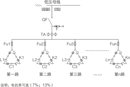低壓TSC動態(tài)無功補償裝置采用人工智能控制,由控制器、雙向可控硅、電容器、電抗器、保護元件等組成??刂破鲗崟r跟蹤測量負荷的功率因數(shù)和無功電流,與預先設定的給定值進線比較,動態(tài)控制電容器組的投切,以保證功率因數(shù)達到設定值。整個測量執(zhí)行過程在一個周波內完成(時間<20ms),并實現(xiàn)可控硅過零觸發(fā),確保投切電容器無沖擊、無涌流、無過渡過程