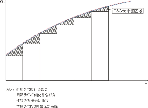 傳統(tǒng)補償裝置采用電容器提供無功功率,電容器組分組容量是固定的,輸出容量有階差,很難達到與系統(tǒng)無功安全平衡,而大容量的SVG成本很高,故我們公司經過多年的實踐和摸索,研發(fā)出了TSVG,采用小容量的SVG大容量的TSC相結合,即節(jié)省了成本又達到了SVG響應速度快、無級性補償?shù)男Ч?,無功容量保證連續(xù)調節(jié)與平滑輸出。