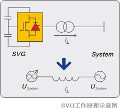 SVG是屬于柔性交流輸電系統(tǒng)(FACTS)的重要裝置,是繼電容器補(bǔ)償、磁控電抗器MCR型SVC、TCR型SVC之后的第三代動(dòng)態(tài)無功補(bǔ)償技術(shù)。它以三相大功率電壓逆變器為核心,其輸出電壓通過變壓器或電抗器接入系統(tǒng),與系統(tǒng)側(cè)電壓保持同頻、同相,通過調(diào)節(jié)其輸出電壓幅值與系統(tǒng)電壓幅值的關(guān)系來確定輸出功率的性質(zhì)與容量,當(dāng)其幅值大于系統(tǒng)側(cè)電壓幅值時(shí)輸出容性無功,小于時(shí)輸出感性無功。其原理如右圖所示。
