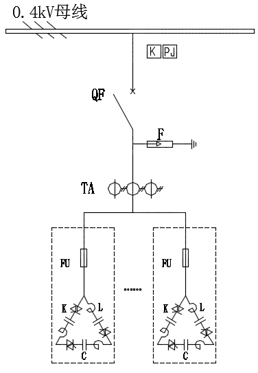 低壓TSC動態(tài)無功補償裝置采用人工智能控制,由控制器、雙向可控硅、電容器、電抗器、保護元件等組成??刂破鲗崟r跟蹤測量負荷的功率因數(shù)和無功電流,與預(yù)先設(shè)定的給定值進線比較,動態(tài)控制電容器組的投切,以保證功率因數(shù)達到設(shè)定值。整個測量執(zhí)行過程在一個周波內(nèi)完成(時間<20ms),并實現(xiàn)可控硅過零觸發(fā),確保投切電容器無沖擊、無涌流、無過渡過程